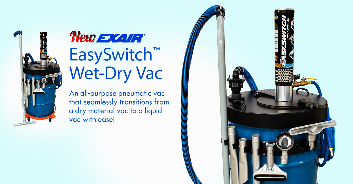 From a number of requests, EXAIR has listened. We have joined our wet vacuum with our dry vacuum to make the EasySwitch Wet-Dry Vac System. This new addition to our Industrial Housekeeping Products allows your customers to replace their electric wet-dry vacuums that fail prematurely, have potential safety issues, and are very loud. Below, I will share the features and benefits of the EasySwitch Wet-Dry Vac System as expected from a leader in this industry.