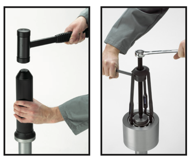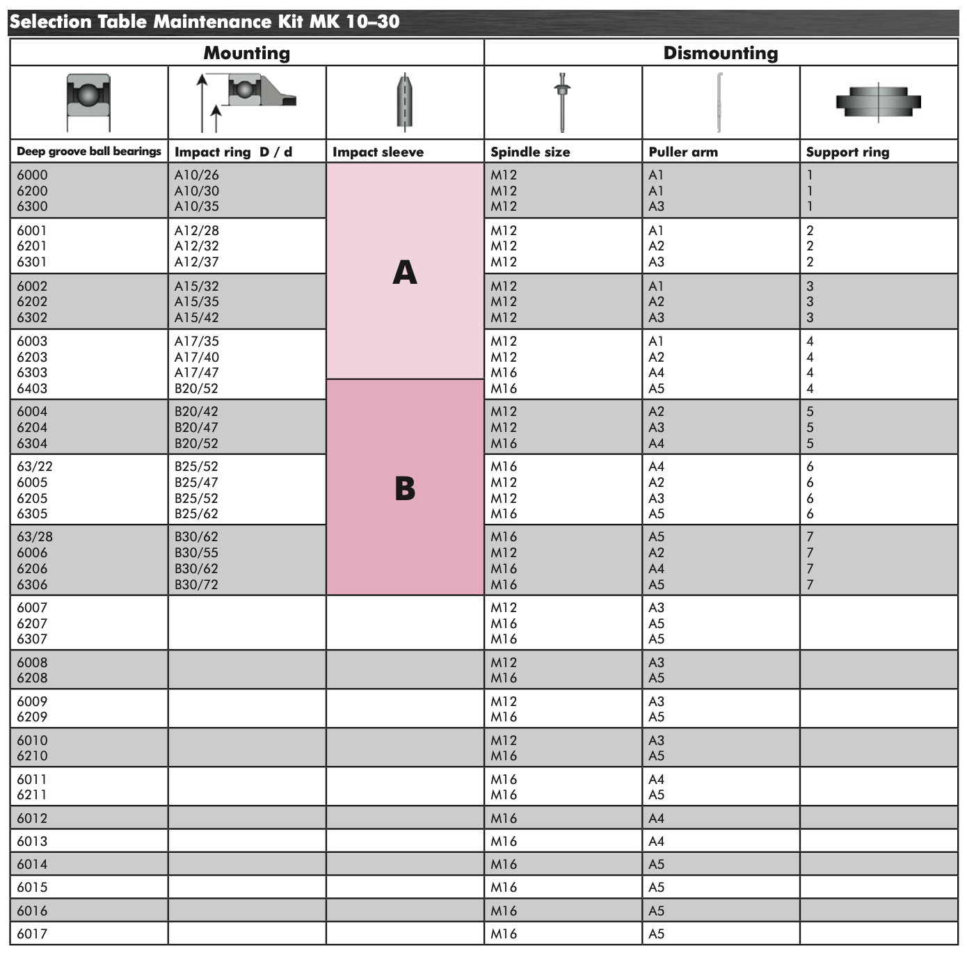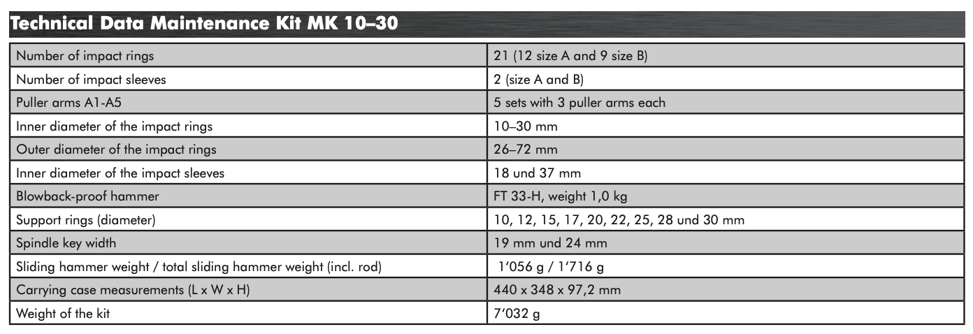 It enables a quick, precise and secure mounting and dismounting of most common bearings with a bore diameter from 10 to 30 mm. For mounting, a multifunctional fitting tool with impact sleeve and impact rings is included, which is suitable for the mounting of bearings as well as bushings, sealings, belt pulleys or similar products. For dismounting, a three-armed bearing puller is included. With the five attached puller arm sets, the puller even fits bearings with a bore diameter up to 85 mm.